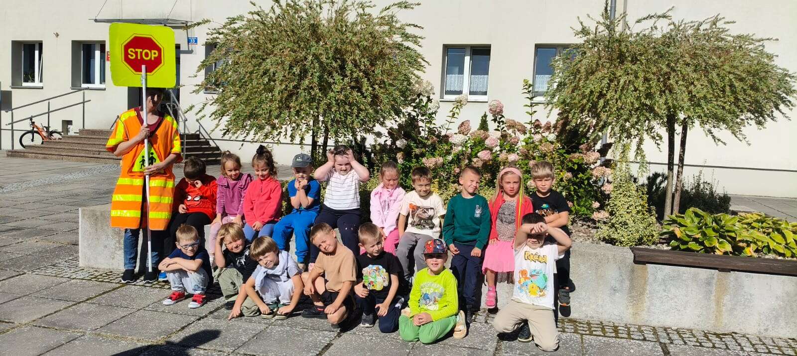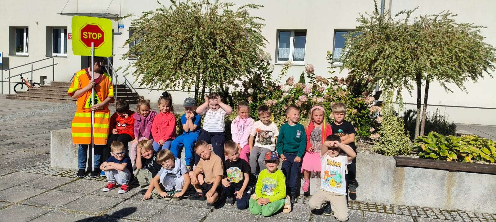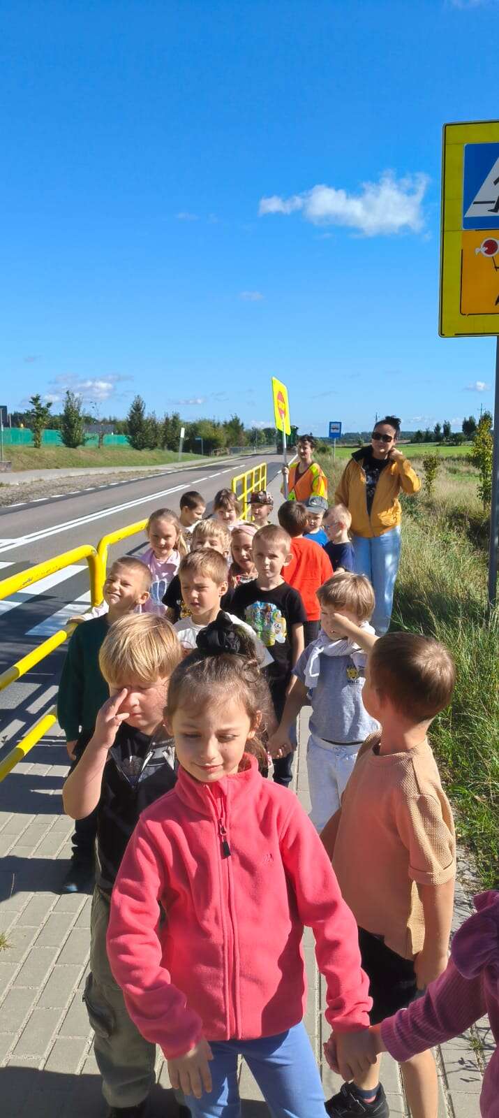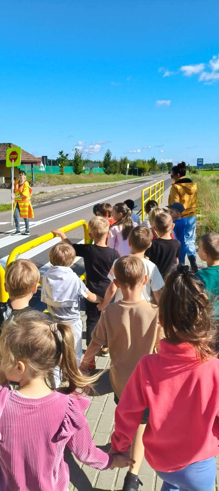 Nie zabrakło też przypomnienia, jak prawidłowo przechodzić przez jezdnię – dzieci ćwiczyły zatrzymywanie się przed pasami, rozglądanie się w obie strony i przechodzenie dopiero wtedy, gdy jest to bezpieczne.