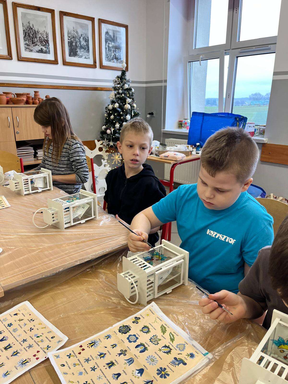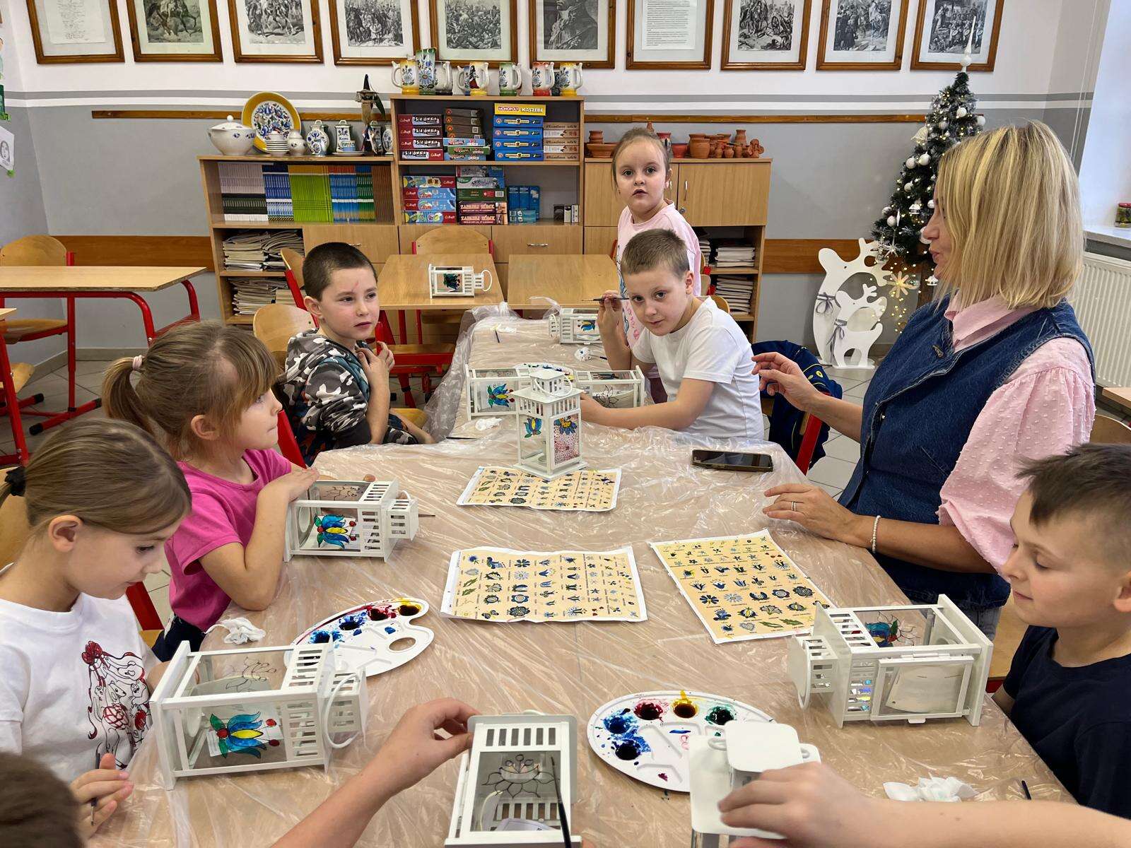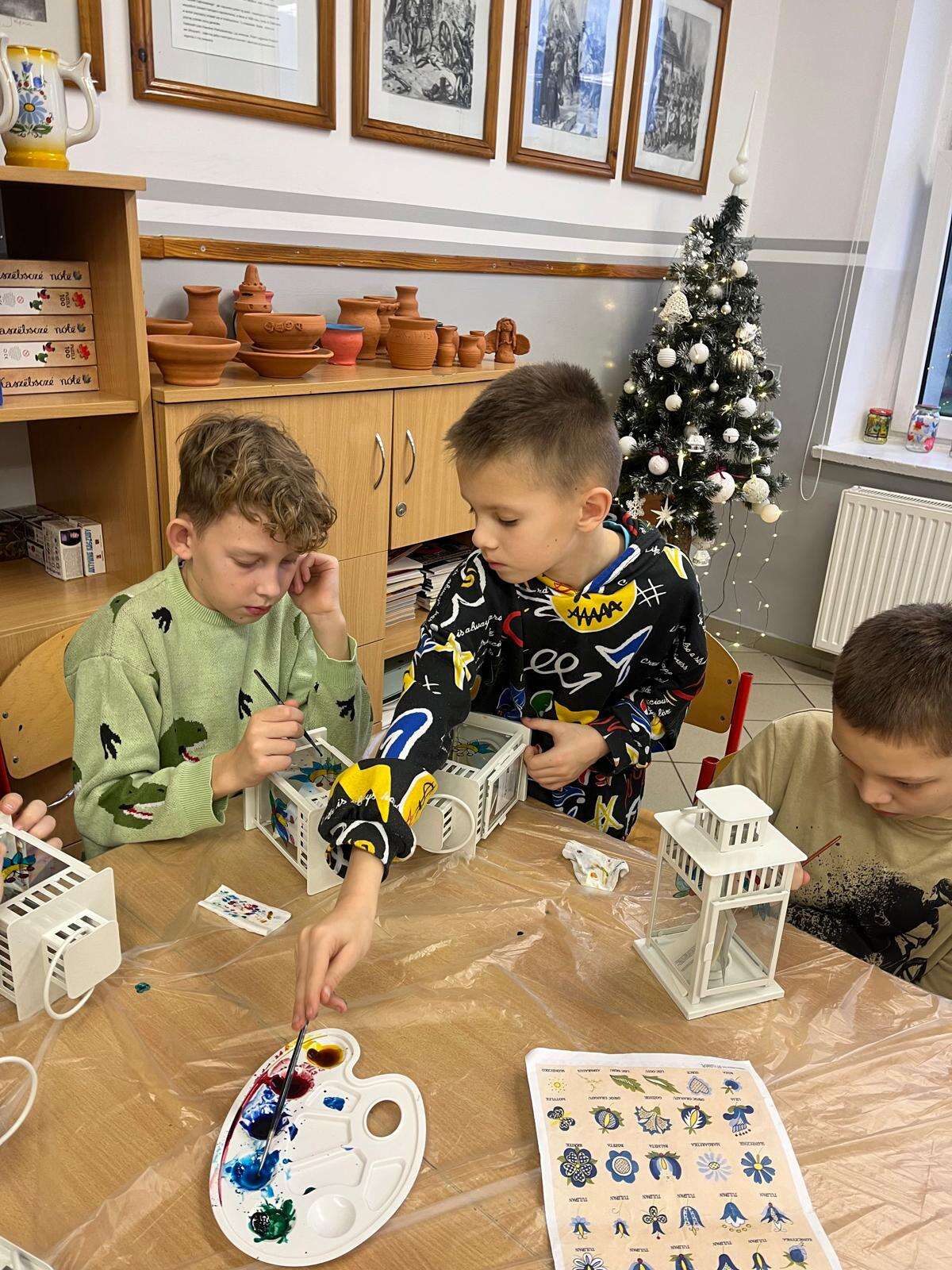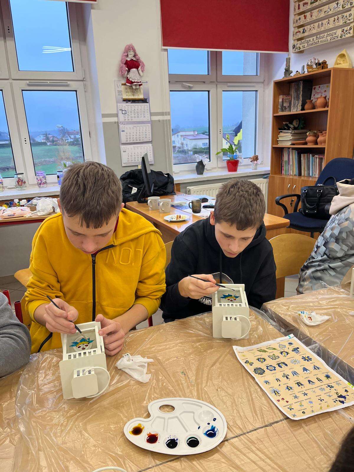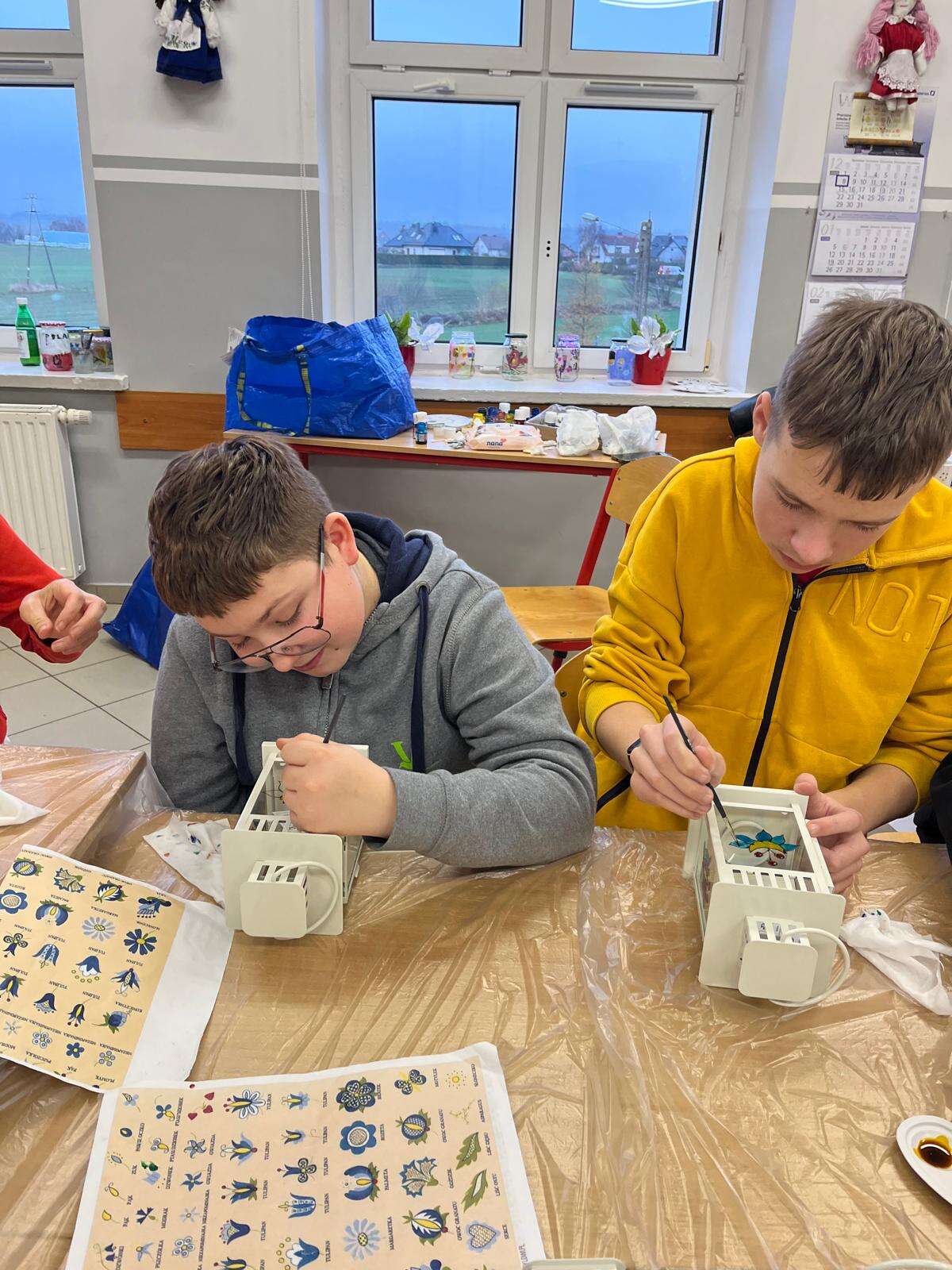 Podczas zajęć dzieci malowały lampiony oraz kubki, zdobiąc je tradycyjnymi wzorami kaszubskimi. Uczniowie z dużym zaangażowaniem i radością tworzyli swoje prace, jednocześnie poznając znaczenie charakterystycznych motywów i kolorów regionu. Każda z wykonanych ozdób była niepowtarzalna i stanowiła piękną, własnoręcznie przygotowaną dekorację świąteczną.