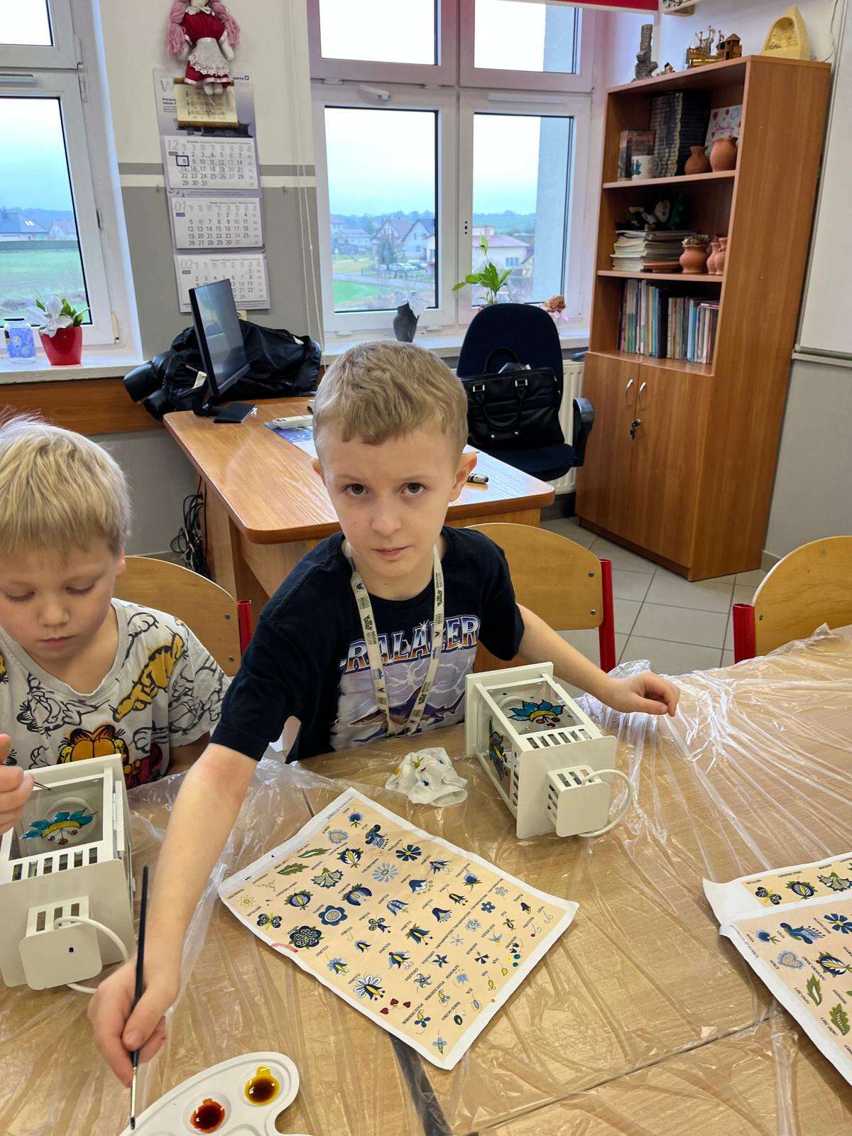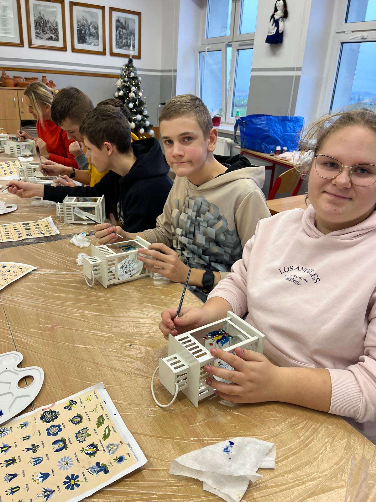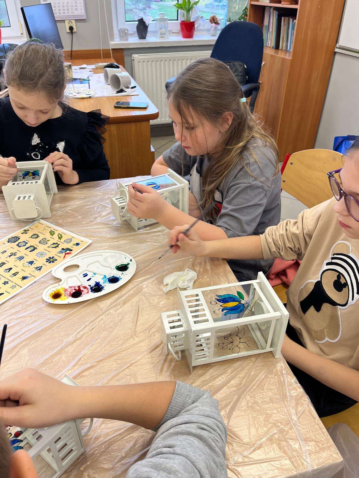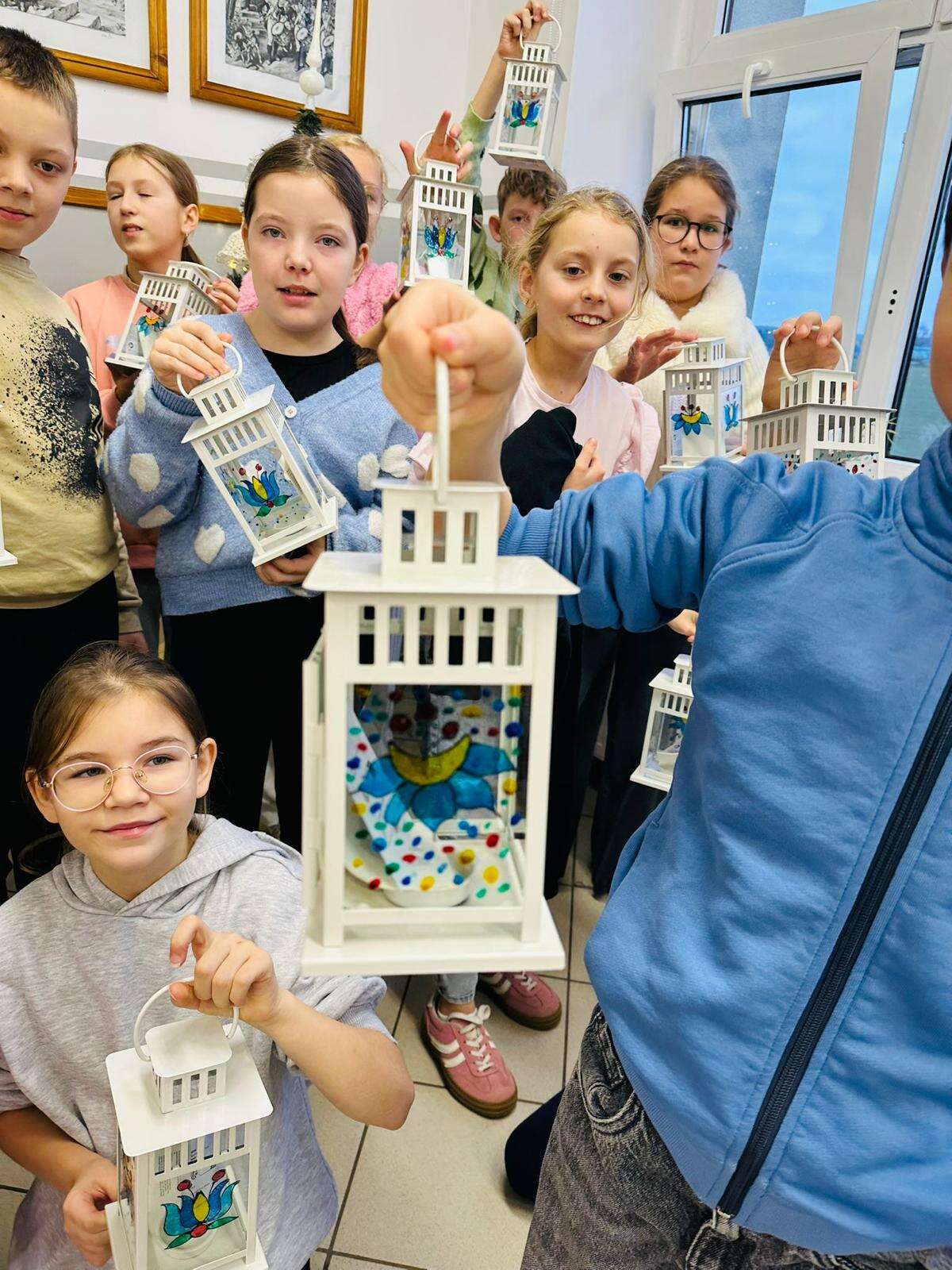 Podczas zajęć dzieci malowały lampiony oraz kubki, zdobiąc je tradycyjnymi wzorami kaszubskimi. Uczniowie z dużym zaangażowaniem i radością tworzyli swoje prace, jednocześnie poznając znaczenie charakterystycznych motywów i kolorów regionu. Każda z wykonanych ozdób była niepowtarzalna i stanowiła piękną, własnoręcznie przygotowaną dekorację świąteczną.