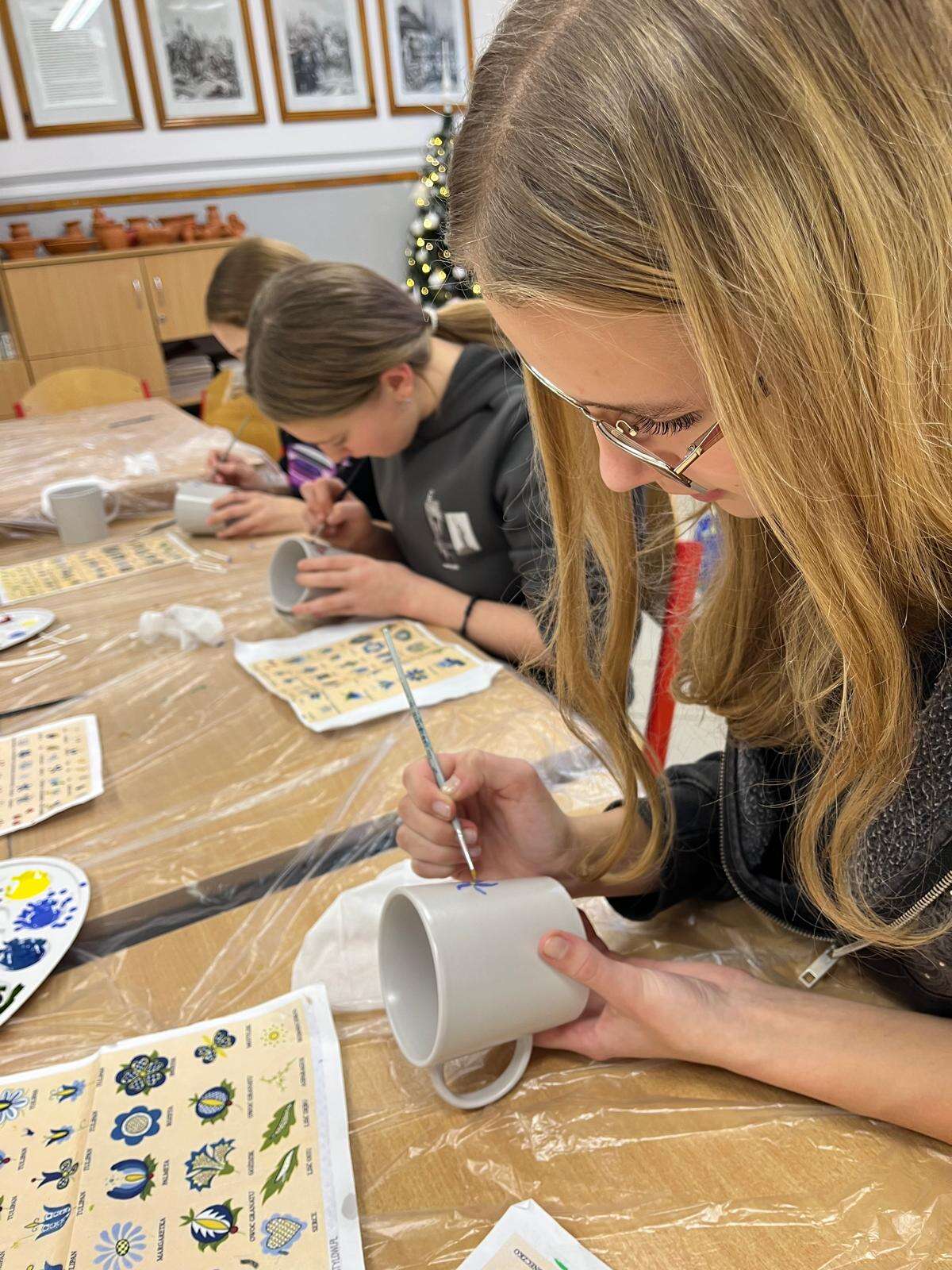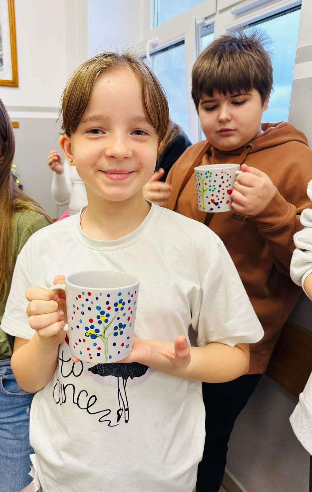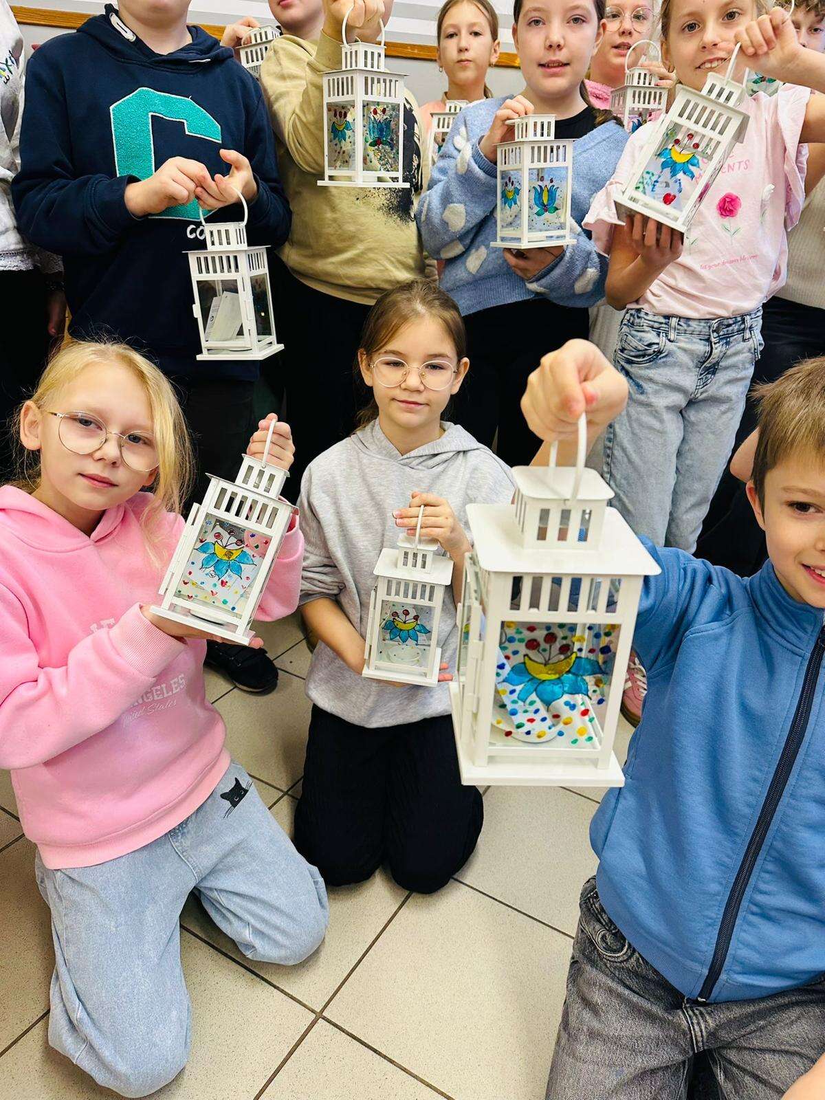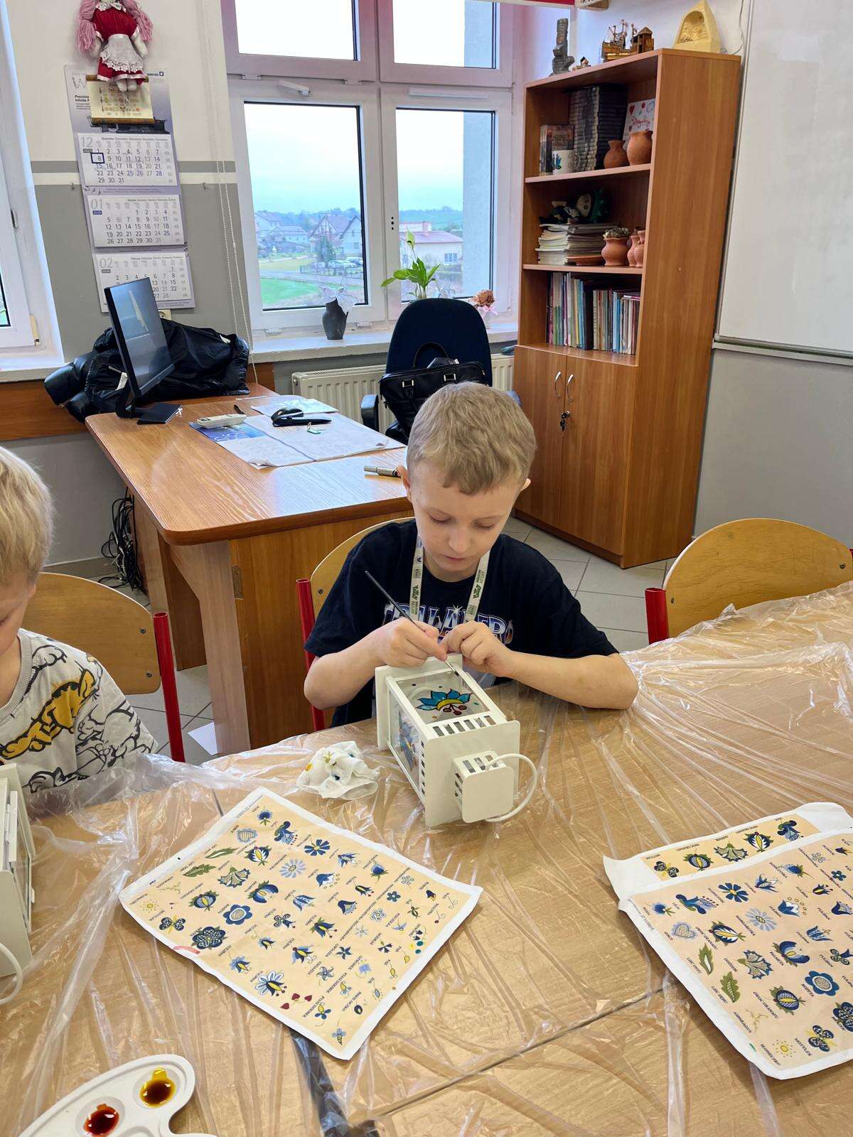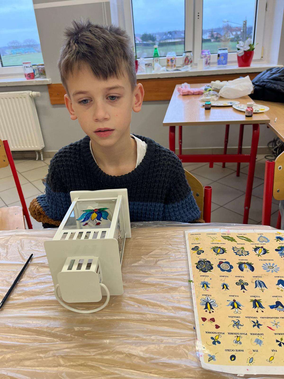 Podczas zajęć dzieci malowały lampiony oraz kubki, zdobiąc je tradycyjnymi wzorami kaszubskimi. Uczniowie z dużym zaangażowaniem i radością tworzyli swoje prace, jednocześnie poznając znaczenie charakterystycznych motywów i kolorów regionu. Każda z wykonanych ozdób była niepowtarzalna i stanowiła piękną, własnoręcznie przygotowaną dekorację świąteczną.