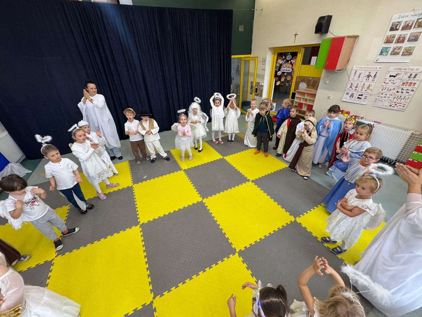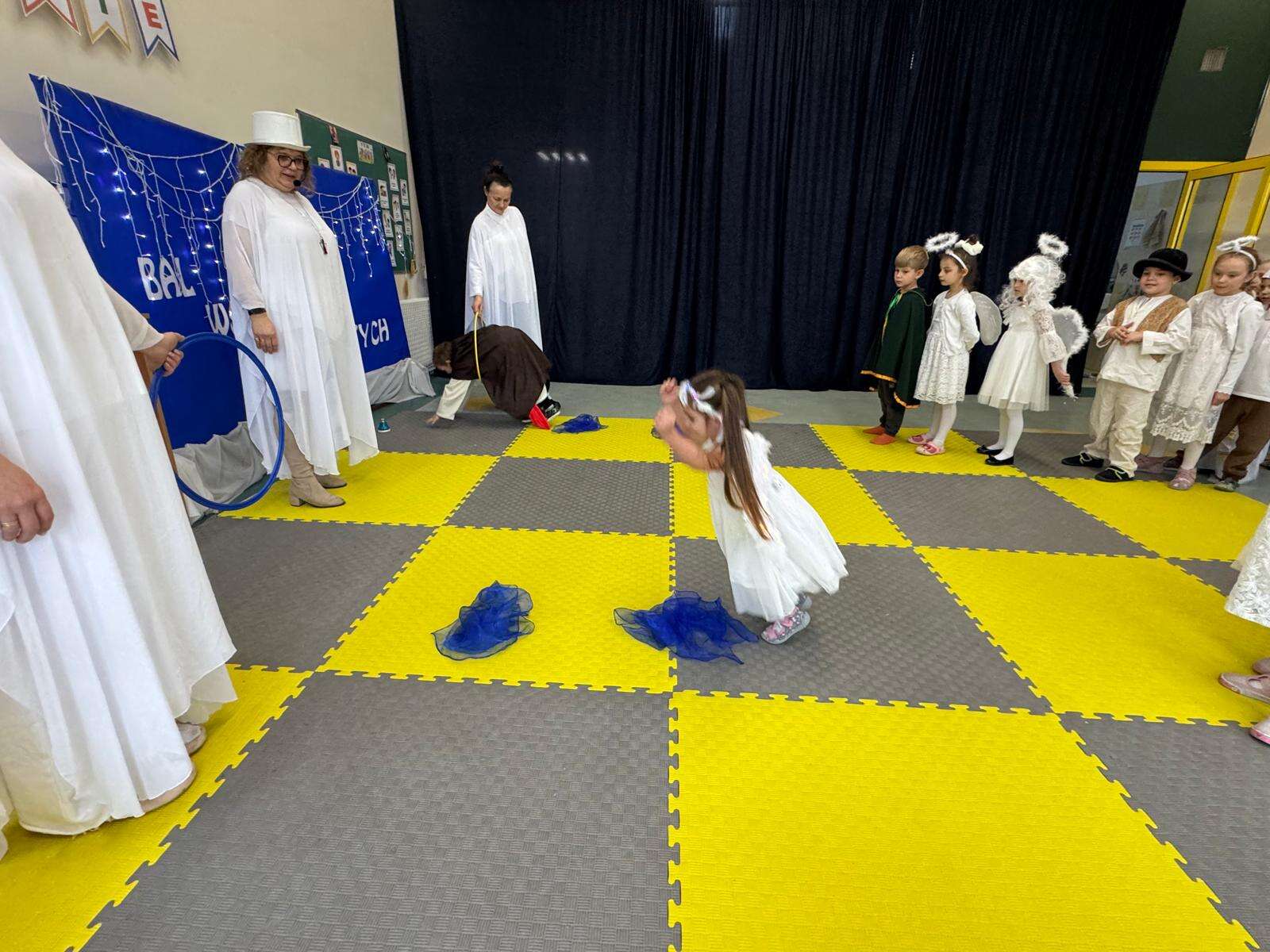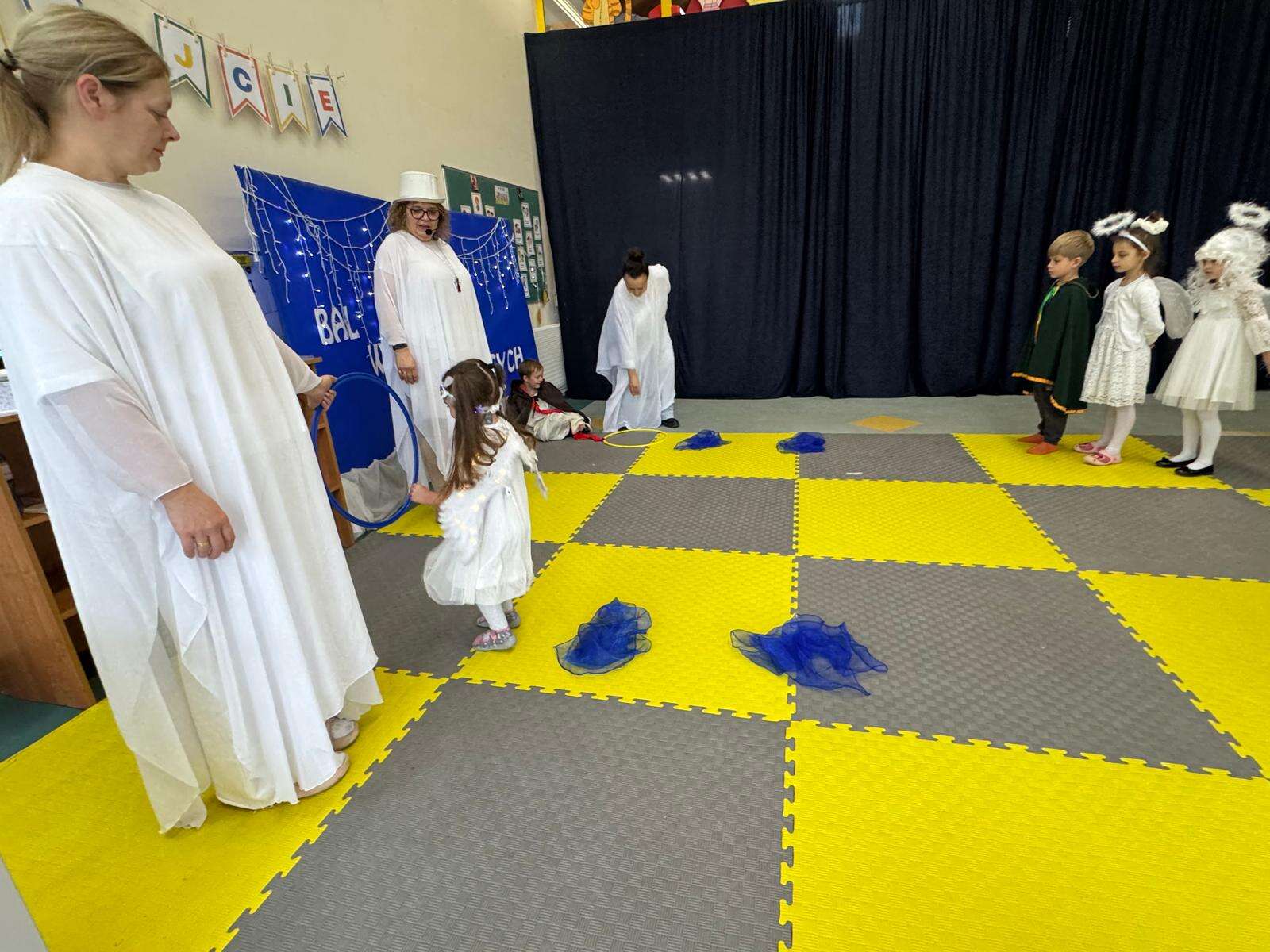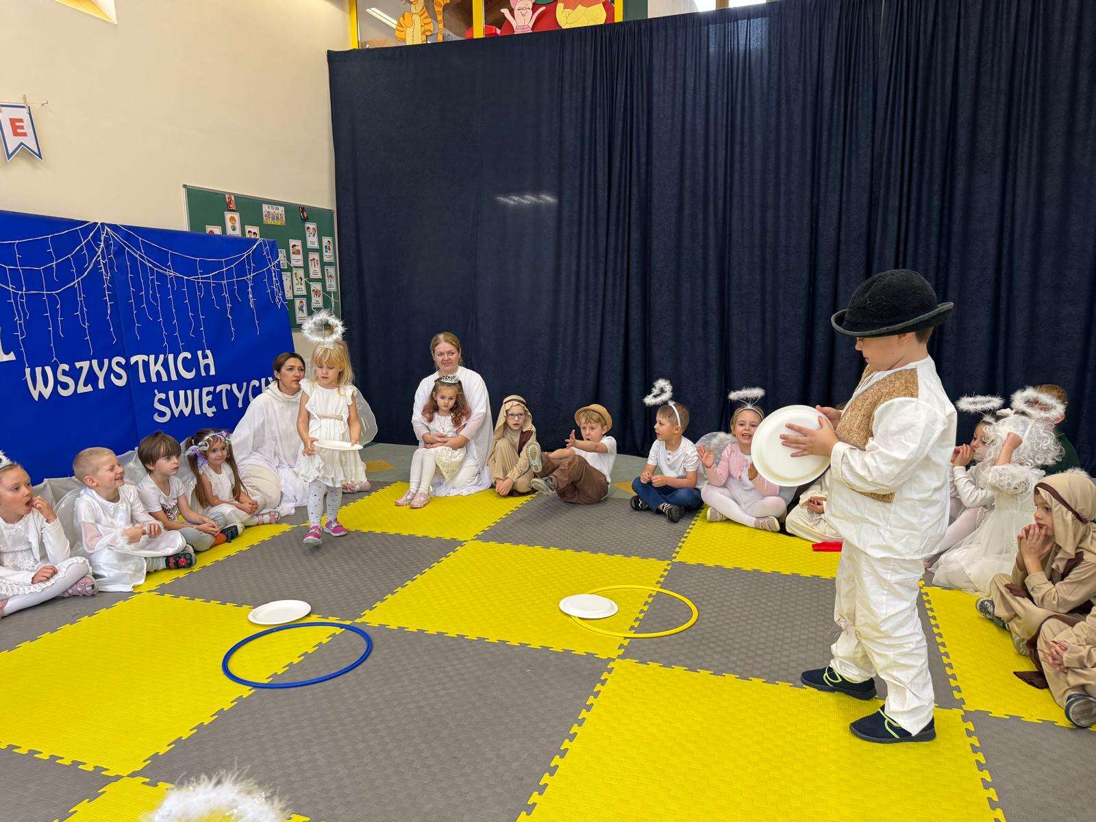 W rytmie piosenek „Niebo jest otwarte”, „Każdy może być święty”, „O Maryjo” i „Niebo jeden świat” połączyły się dwa światy – niebo i ziemia. Dzieci z uśmiechem tańczyły w rytmie anielskiej muzyki, celnie rzucały „aureolą” do nieba i z radością pokonywały „rajski tor przeszkód”, na końcu którego dzwoniły dzwoneczkiem, by św. Piotr otworzył im niebiańskie bramy.