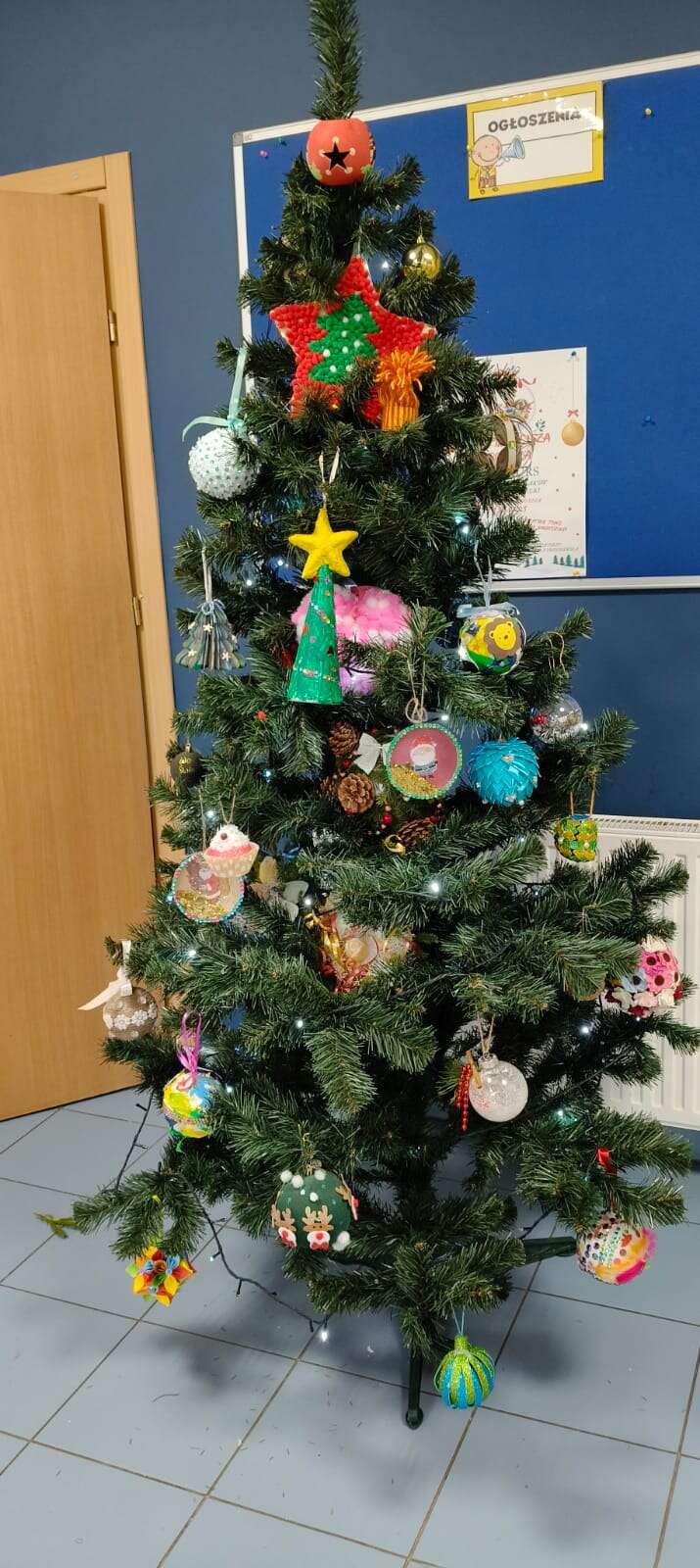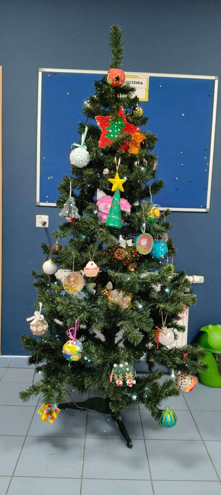 Ozdoby konkursowe zawisły na przedszkolnej choince w szatni, nadając jej niepowtarzalny, świąteczny charakter i ciesząc wszystkich odwiedzających.