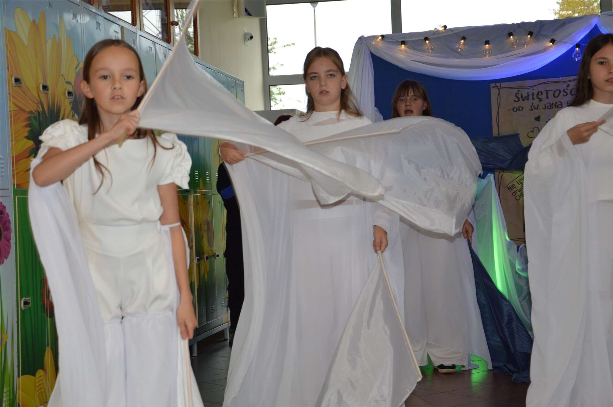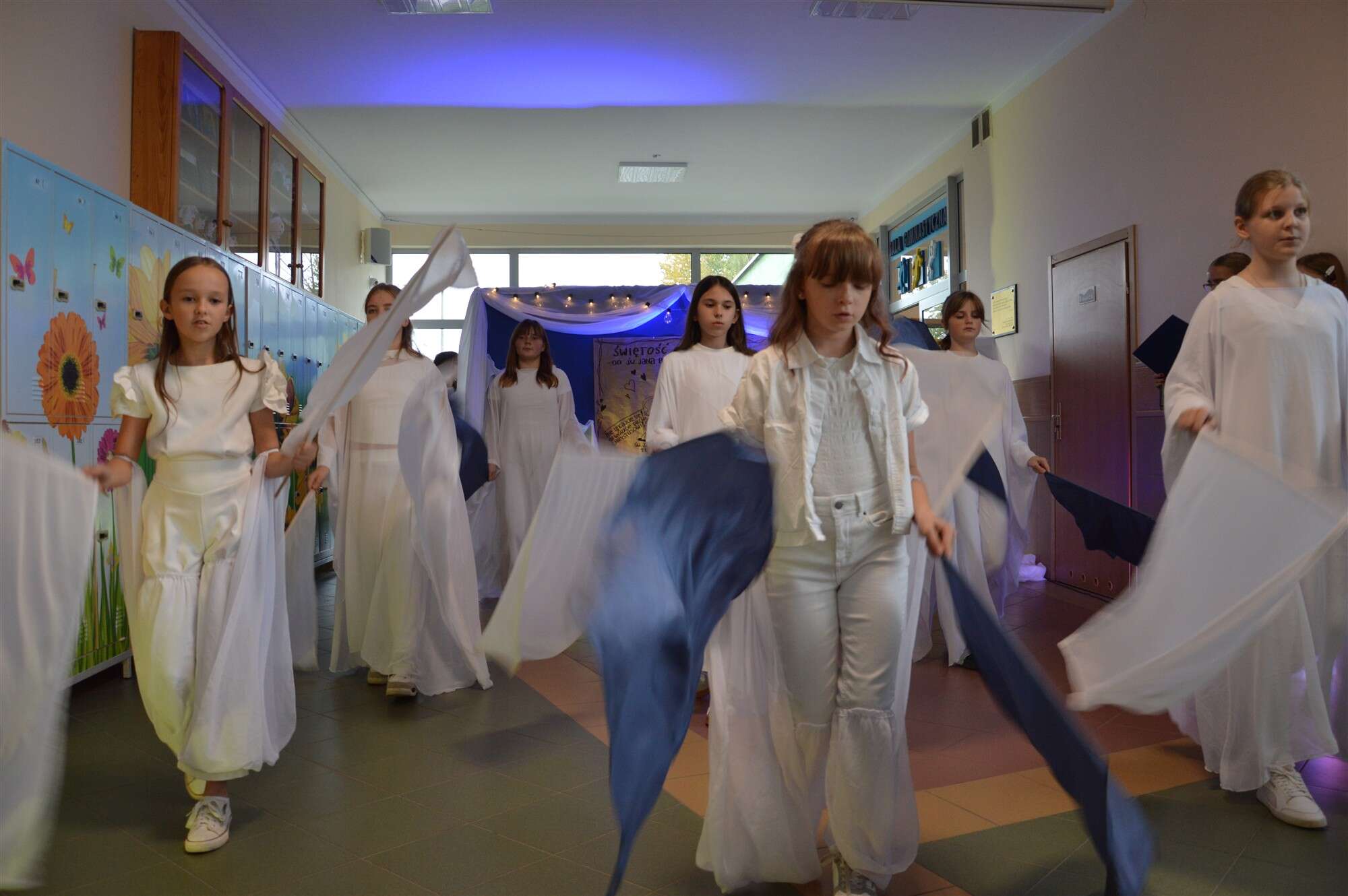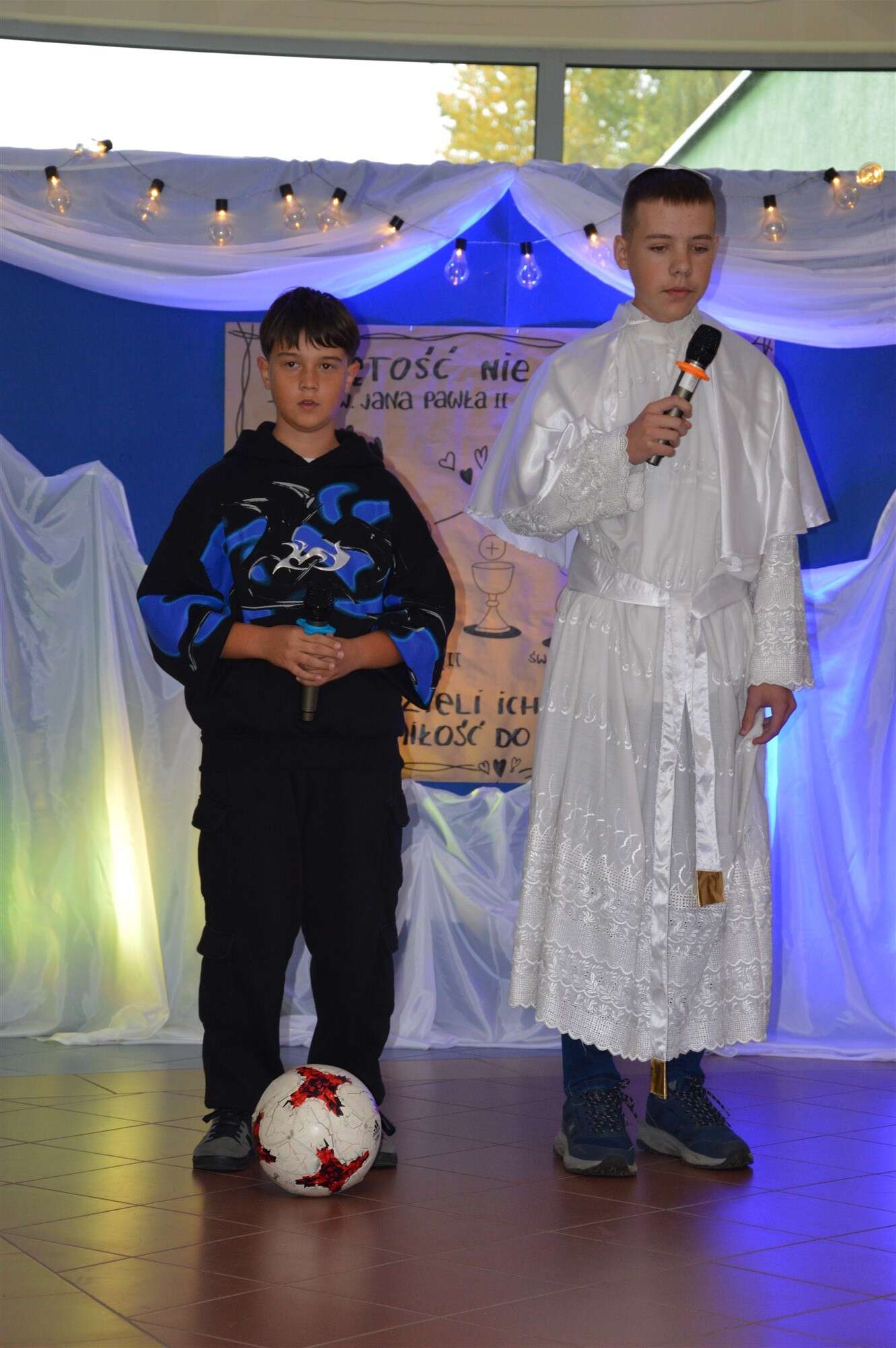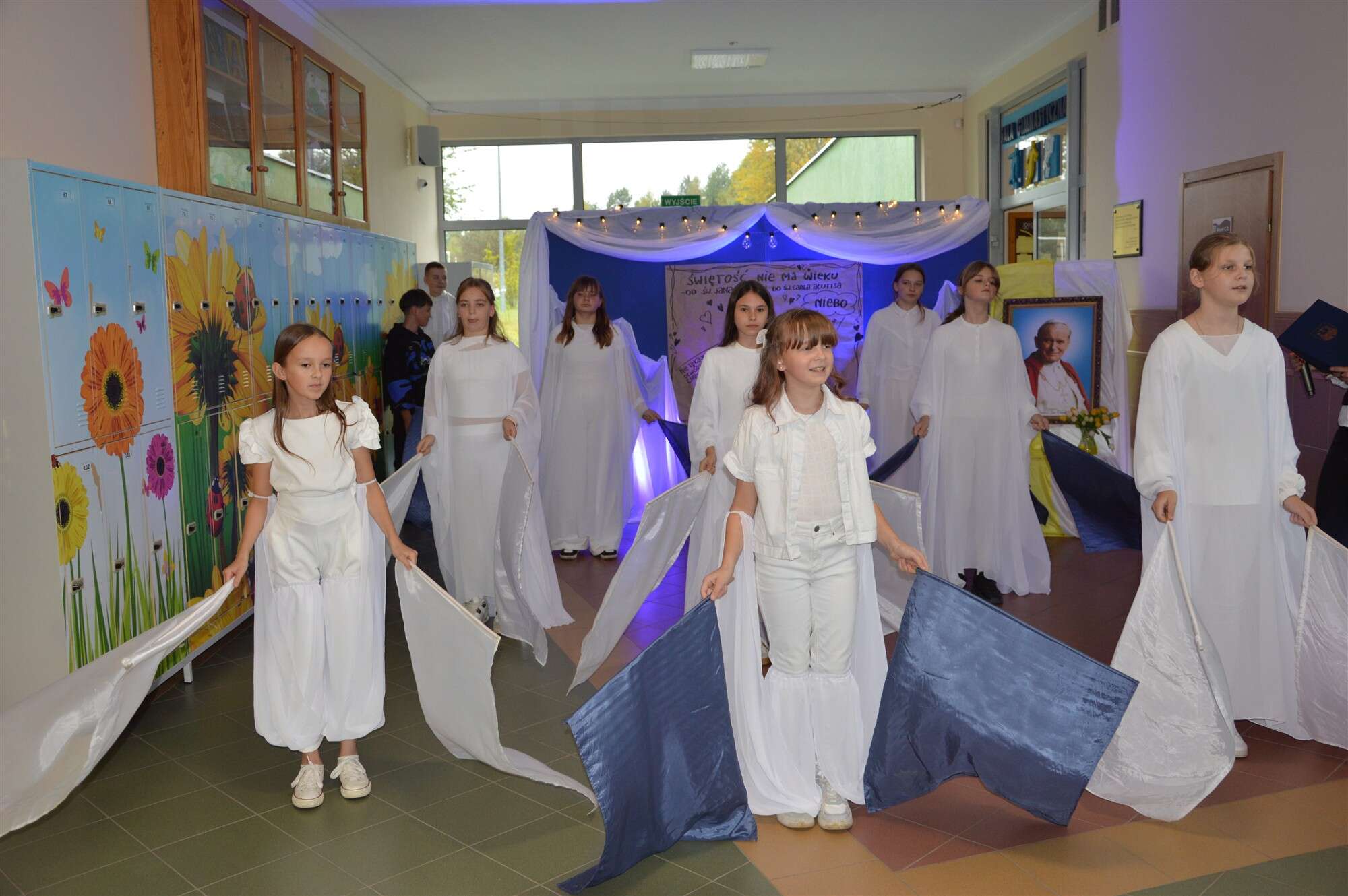 W przedstawieniu uczniowie ukazali spotkanie dwóch świadków wiary – św. Jana Pawła II oraz św. Carla Acutisa. W słowach, pieśniach i tańcu przypomniano, że świętość jest drogą dla każdego człowieka – zarówno dorosłych, jak i młodych. Wystąpili m.in. narratorzy, schola szkolna, dzieci z oddziału zerówkowego, dziewczęta z flagami oraz zespół kaszubski, który zaśpiewał pieśni w języku kaszubskim i zaprezentował tradycyjne tańce.