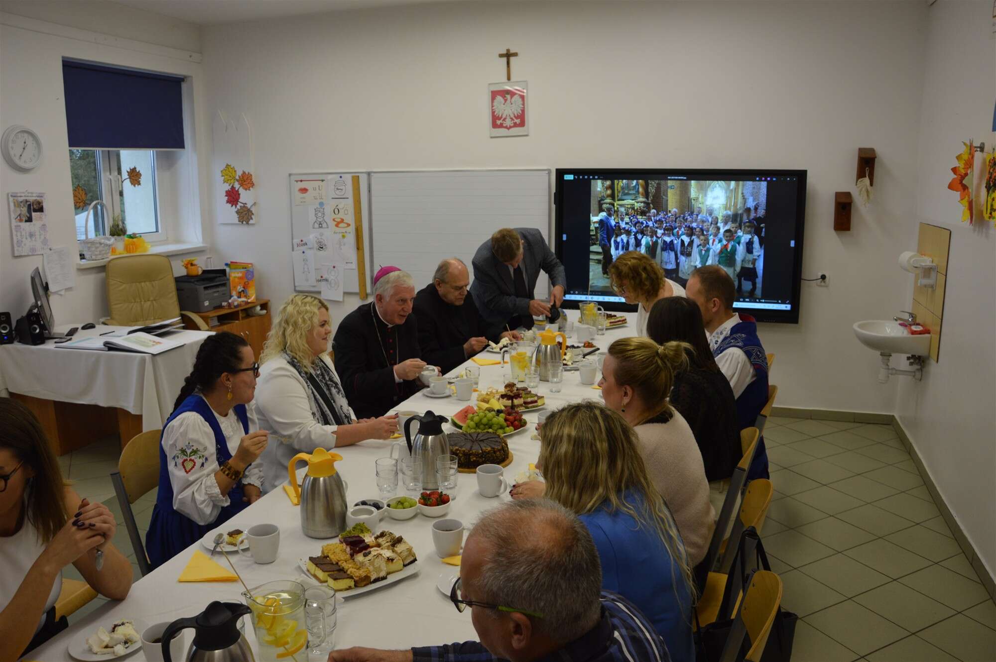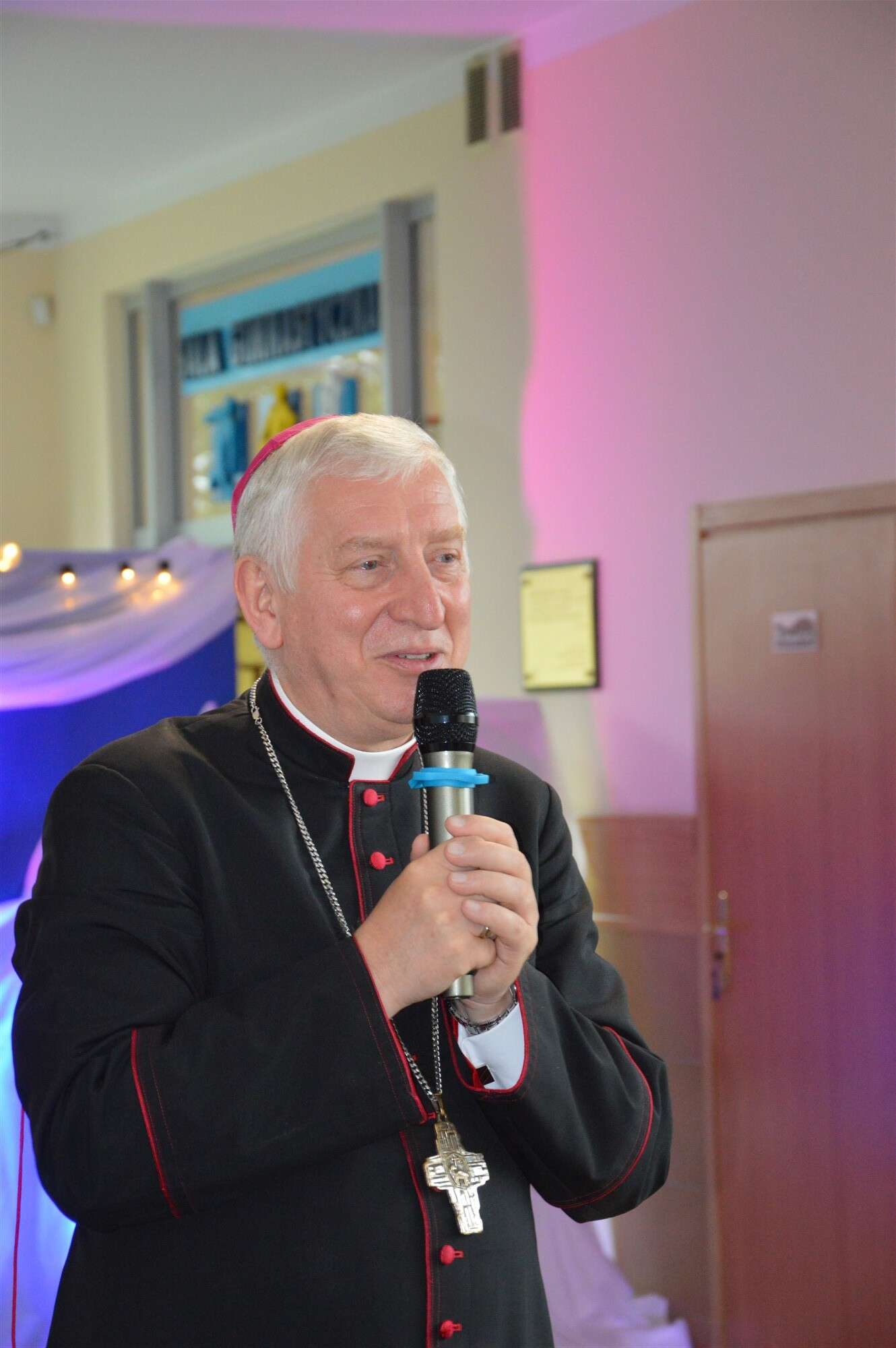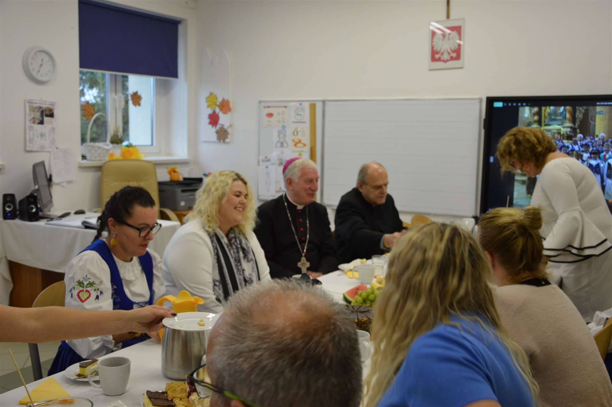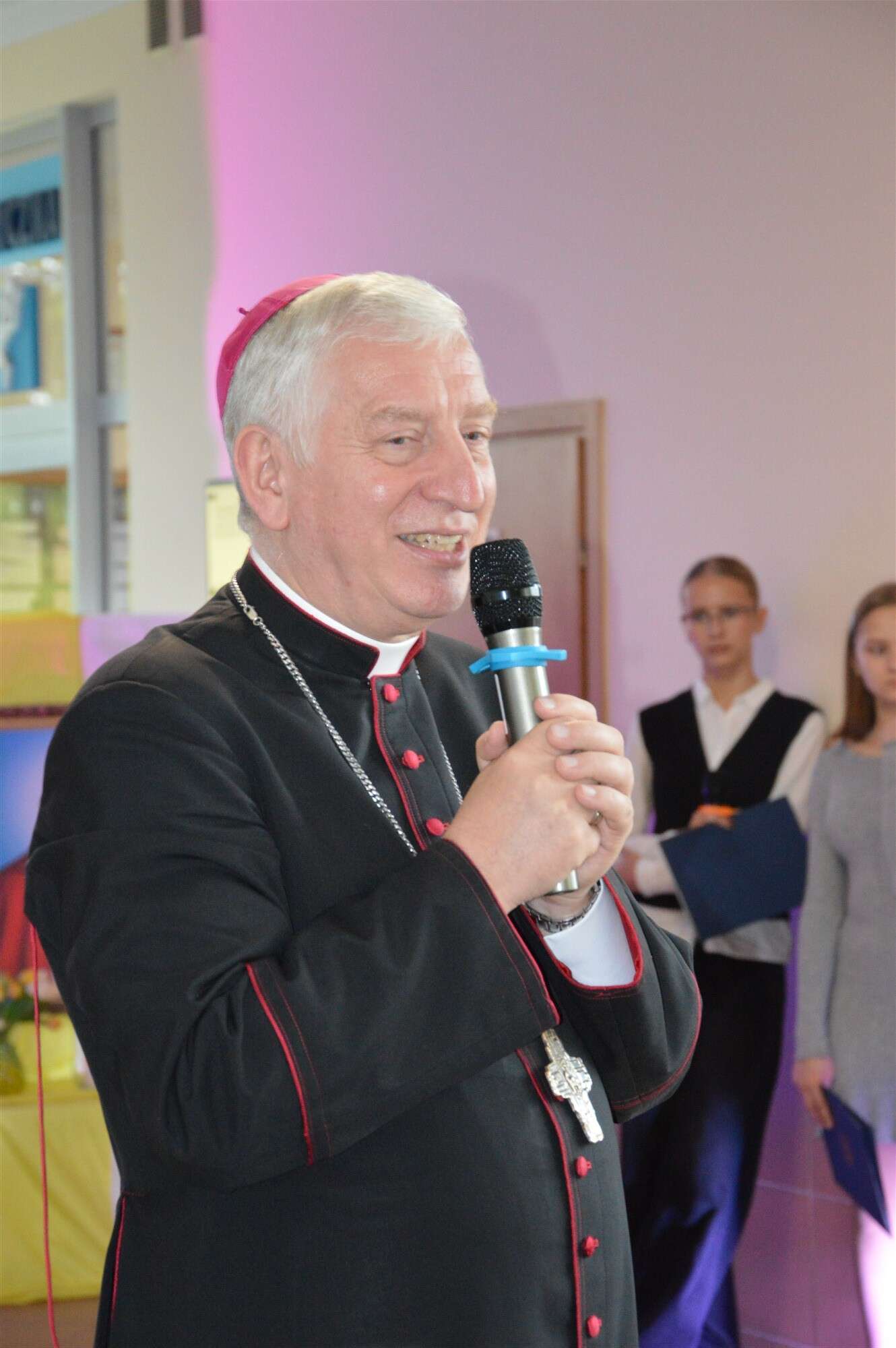 Po części artystycznej ks. biskup spotkał się także z nauczycielami i pracownikami szkoły przy wspólnej kawie, dzieląc się słowem wdzięczności i życzliwości. Uroczystość zakończyły podziękowania, które w imieniu całej społeczności szkolnej skierował pan dyrektor Andrzej Marmołowski.