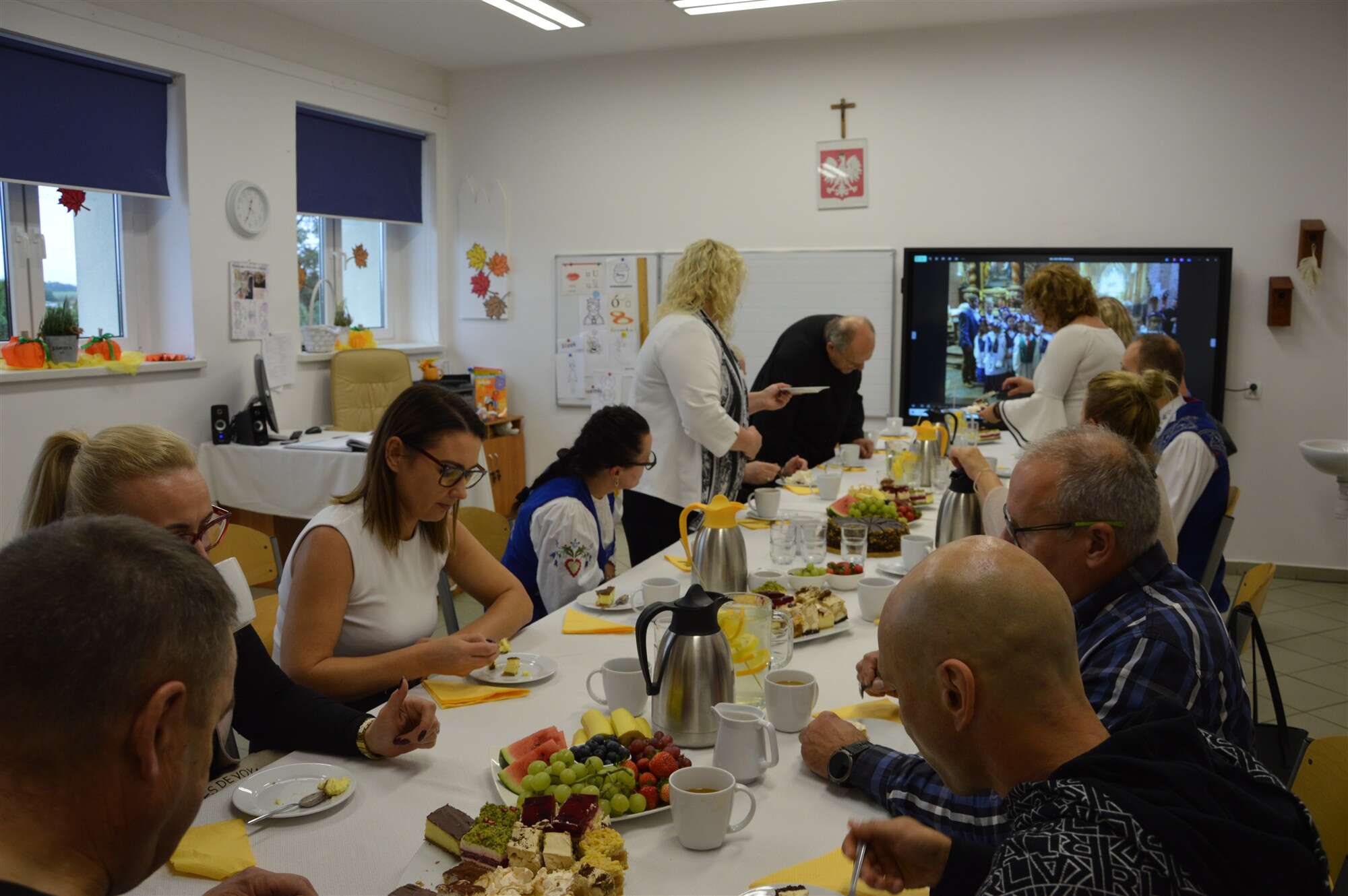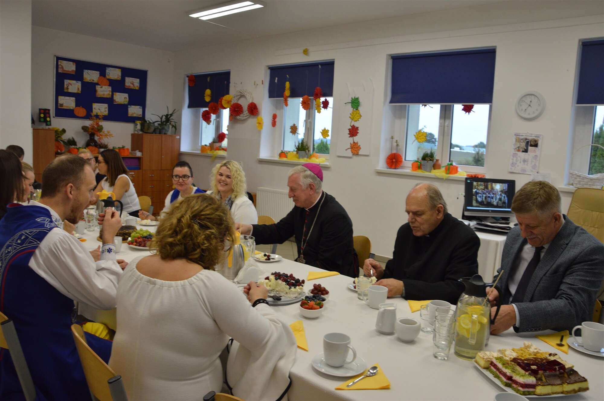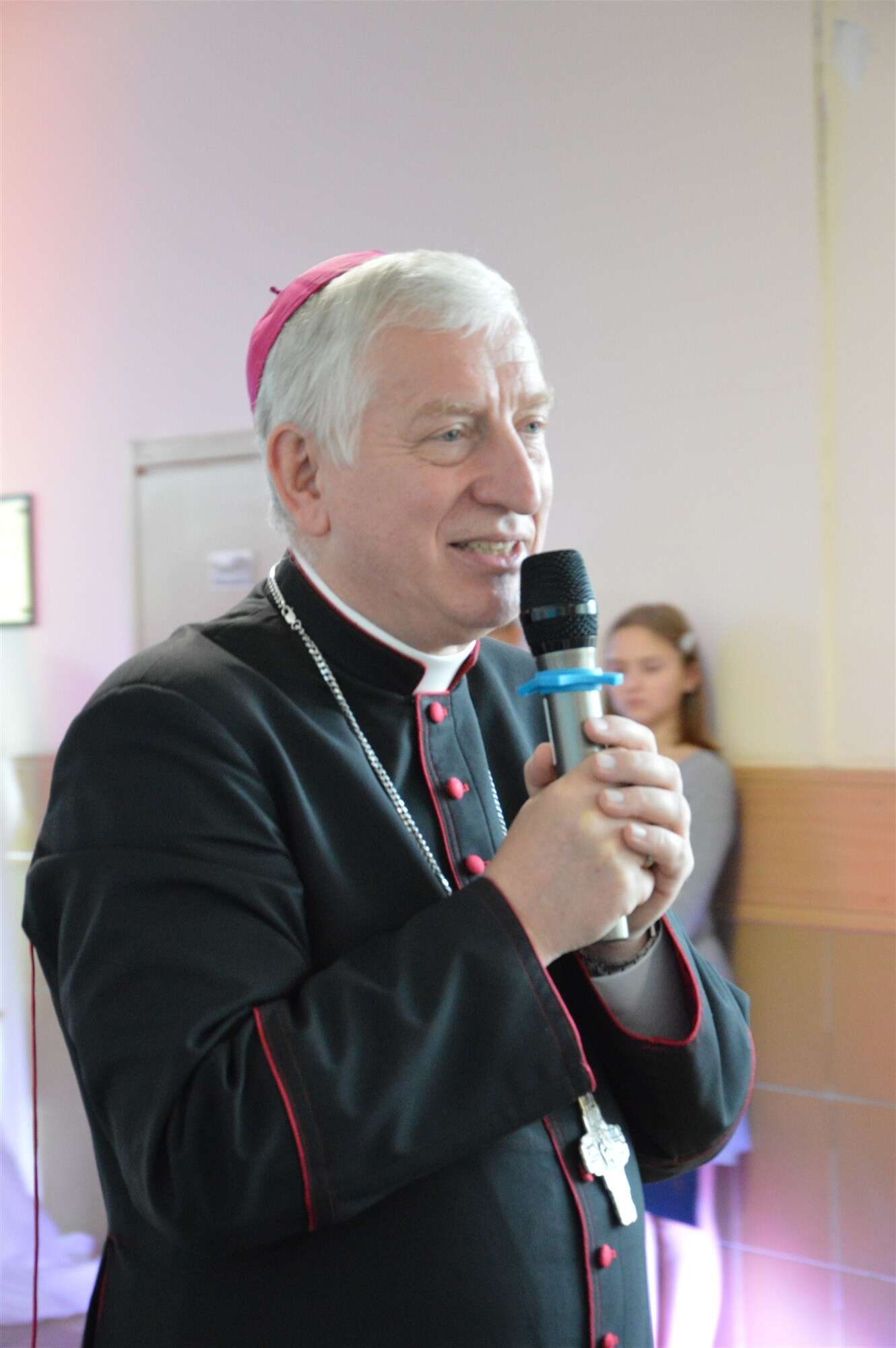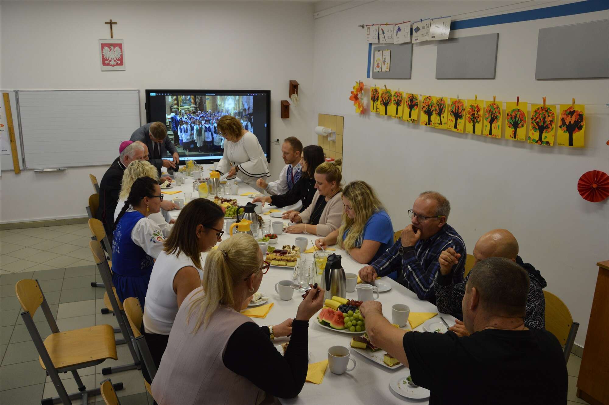 Po części artystycznej ks. biskup spotkał się także z nauczycielami i pracownikami szkoły przy wspólnej kawie, dzieląc się słowem wdzięczności i życzliwości. Uroczystość zakończyły podziękowania, które w imieniu całej społeczności szkolnej skierował pan dyrektor Andrzej Marmołowski.