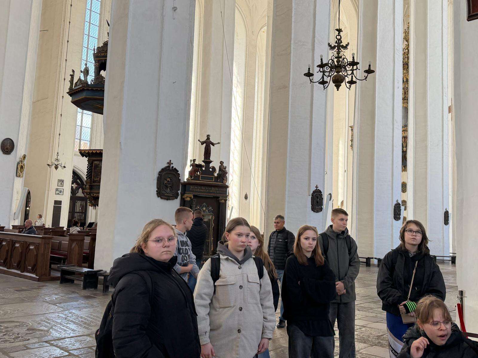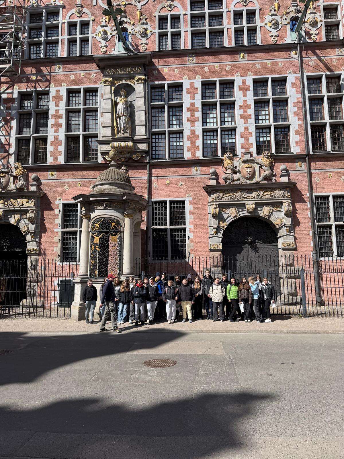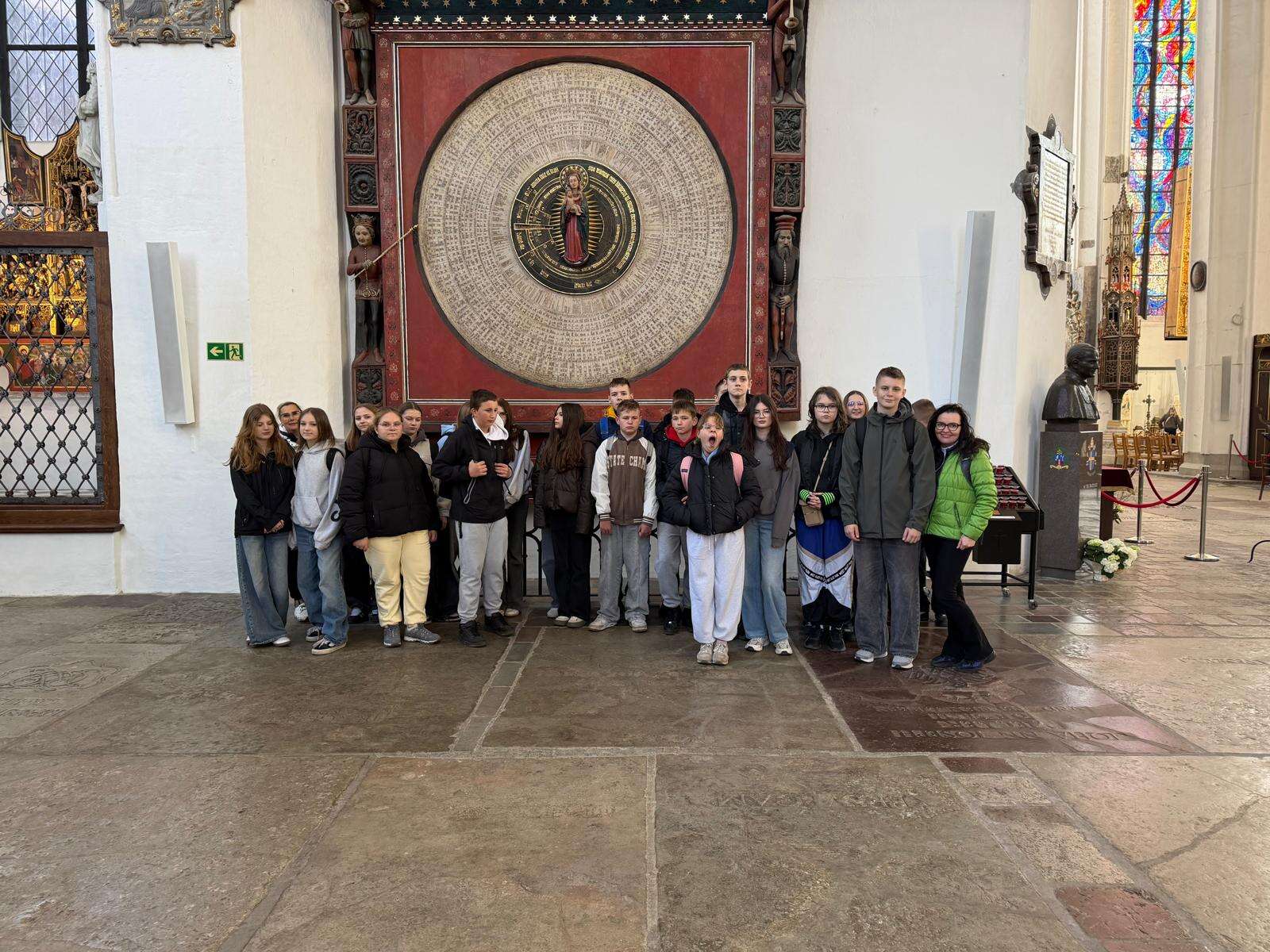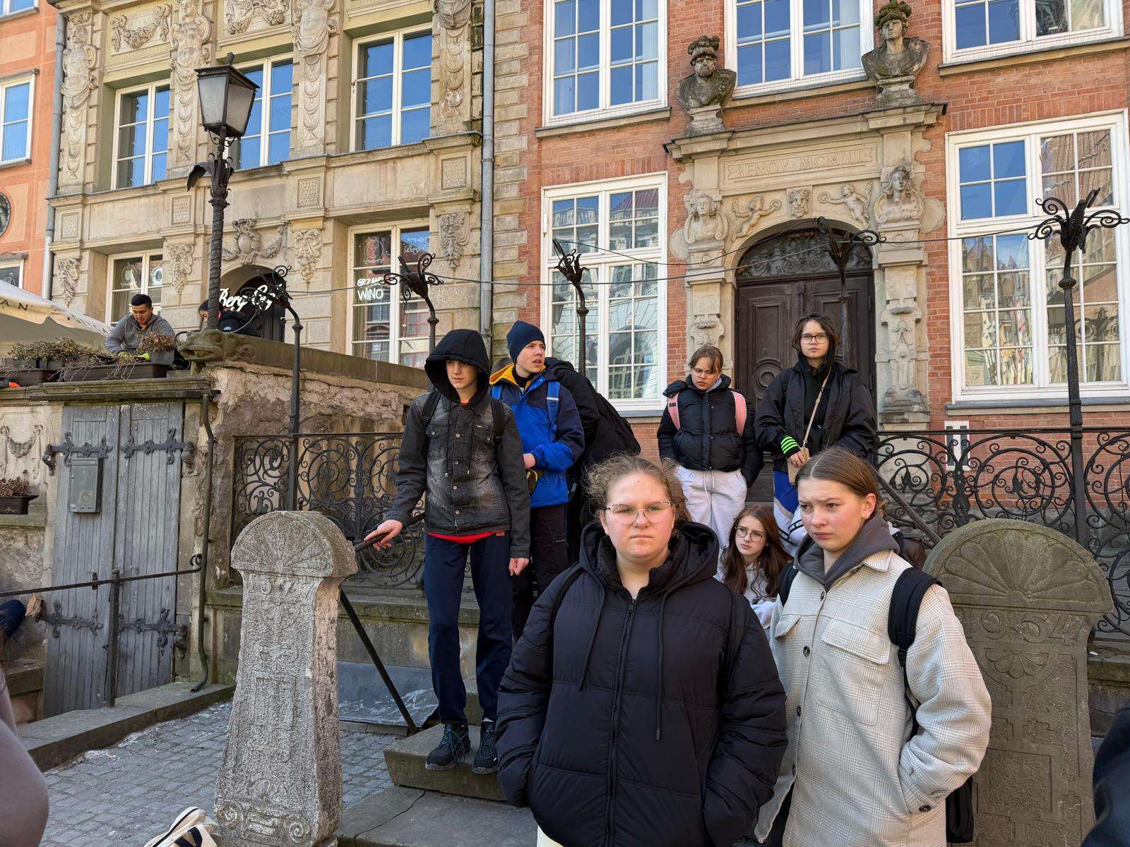 Spacer z przewodnikiem poprowadził uczestników przez serce miasta – ulicę Długą i Długi Targ, gdzie historia przeplata się z codziennym życiem. Uczniowie z zaciekawieniem słuchali opowieści o dawnych kupcach i mieszkańcach Gdańska, podziwiając Fontannę Neptuna – symbol miasta. Kolejnym punktem programu była imponująca Bazylika Mariacka, której ogrom i niezwykła architektura zrobiły na wszystkich duże wrażenie. Nie zabrakło również wizyty przy słynnym Żurawiu nad Motławą – jednym z najstarszych portowych dźwigów w Europie, przypominającym o bogatej, morskiej historii miasta.