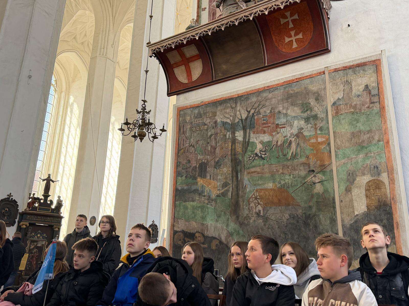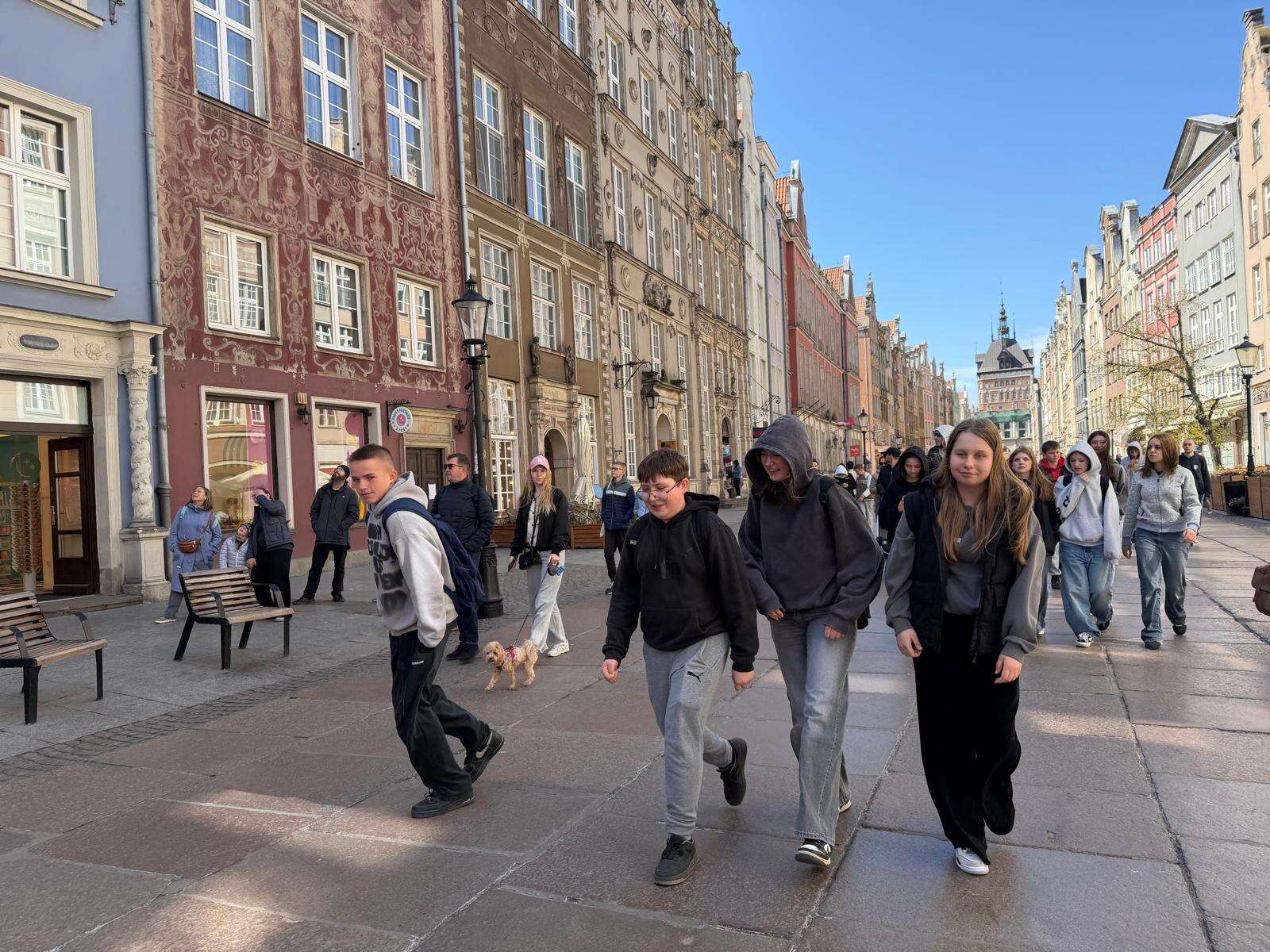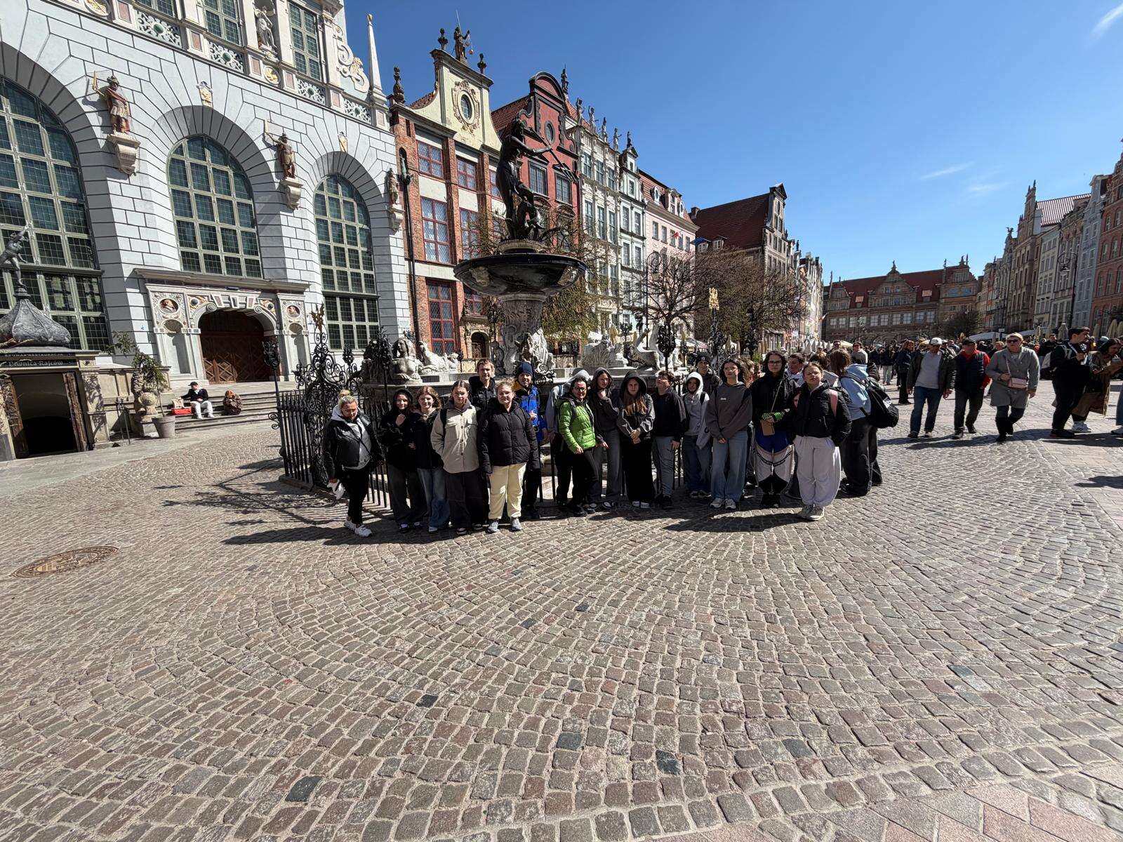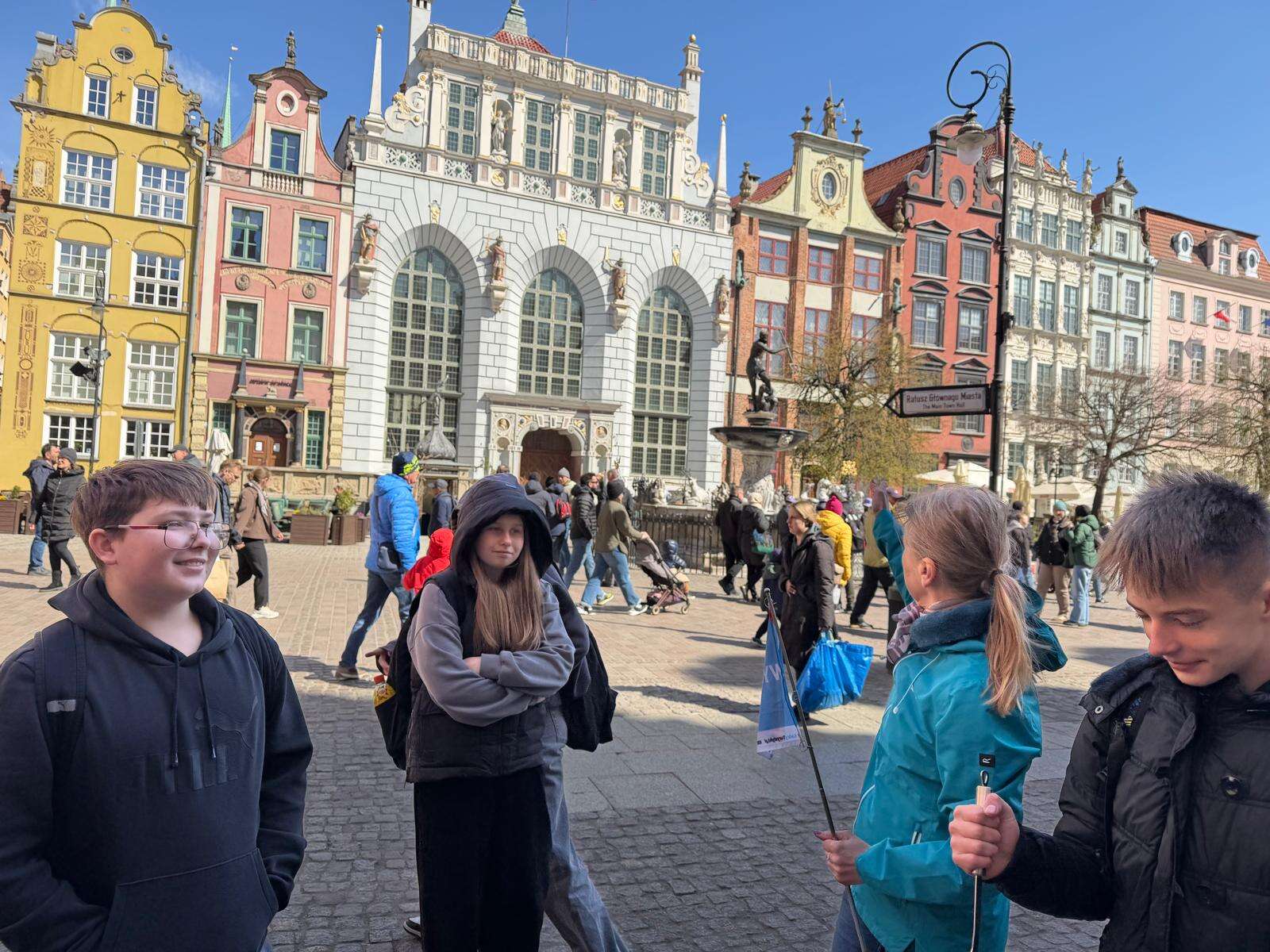 Spacer z przewodnikiem poprowadził uczestników przez serce miasta – ulicę Długą i Długi Targ, gdzie historia przeplata się z codziennym życiem. Uczniowie z zaciekawieniem słuchali opowieści o dawnych kupcach i mieszkańcach Gdańska, podziwiając Fontannę Neptuna – symbol miasta. Kolejnym punktem programu była imponująca Bazylika Mariacka, której ogrom i niezwykła architektura zrobiły na wszystkich duże wrażenie. Nie zabrakło również wizyty przy słynnym Żurawiu nad Motławą – jednym z najstarszych portowych dźwigów w Europie, przypominającym o bogatej, morskiej historii miasta.